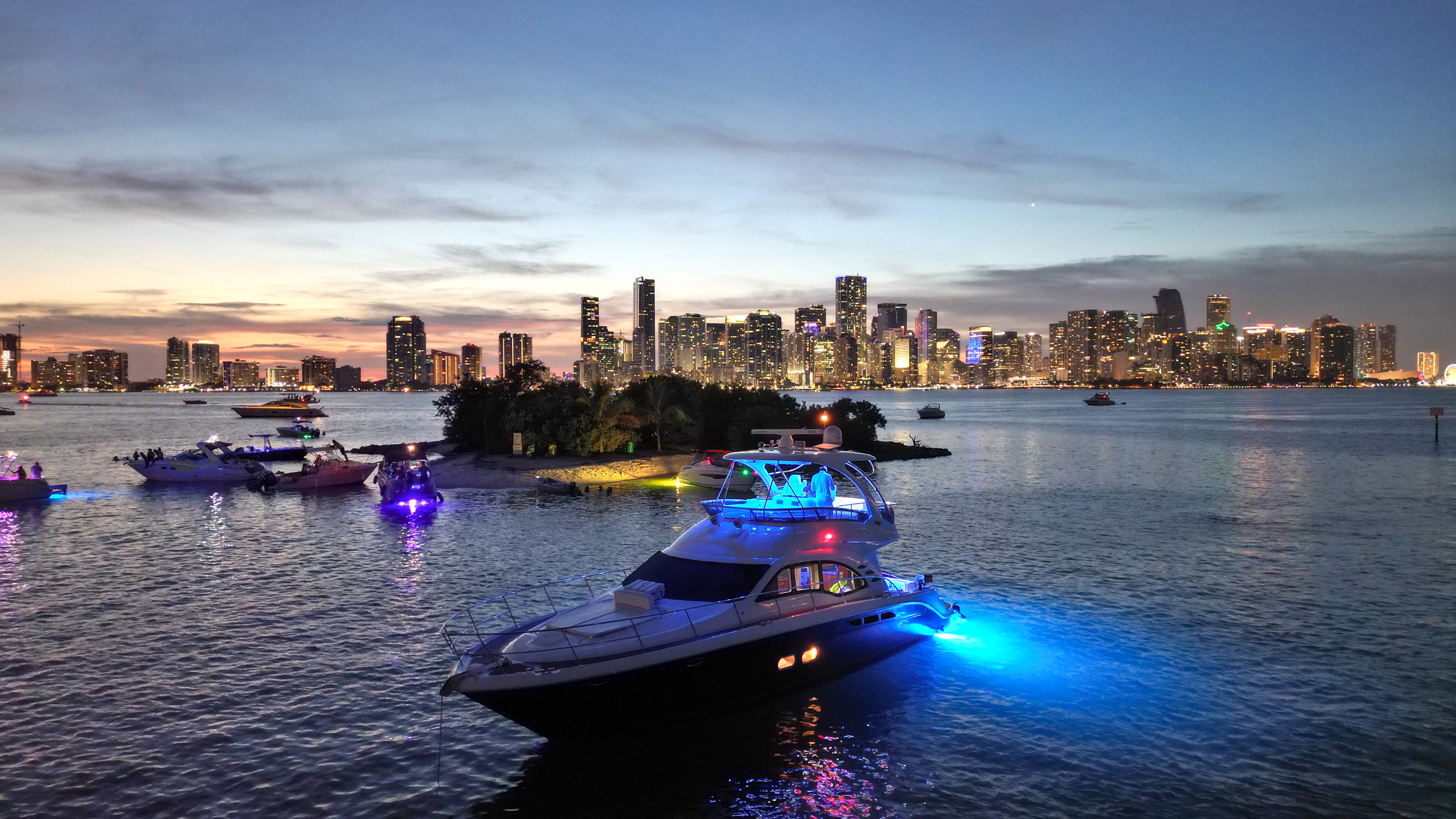 We will take you to the main islands of the bay, Star Island, Palm Island, and Hibiscus Island. The view from the water is amazing, you will see the skyline of Miami. We'll anchor at Star Island or another island of your preference.